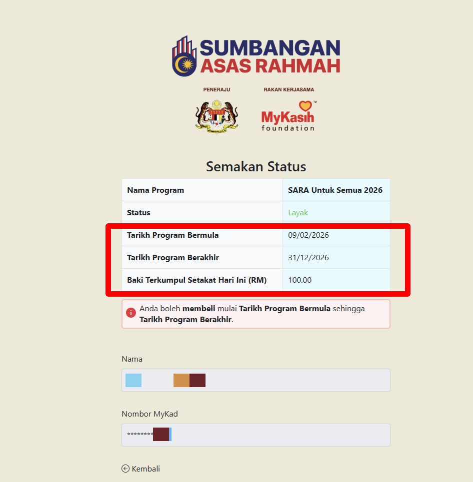 The one-off RM100 Sumbangan Asas Rahmah (SARA) will be credited to all eligible Malaysians today, 9th February 2026. This is the second round of the one-off SARA programme which was announced during Budget 2026.