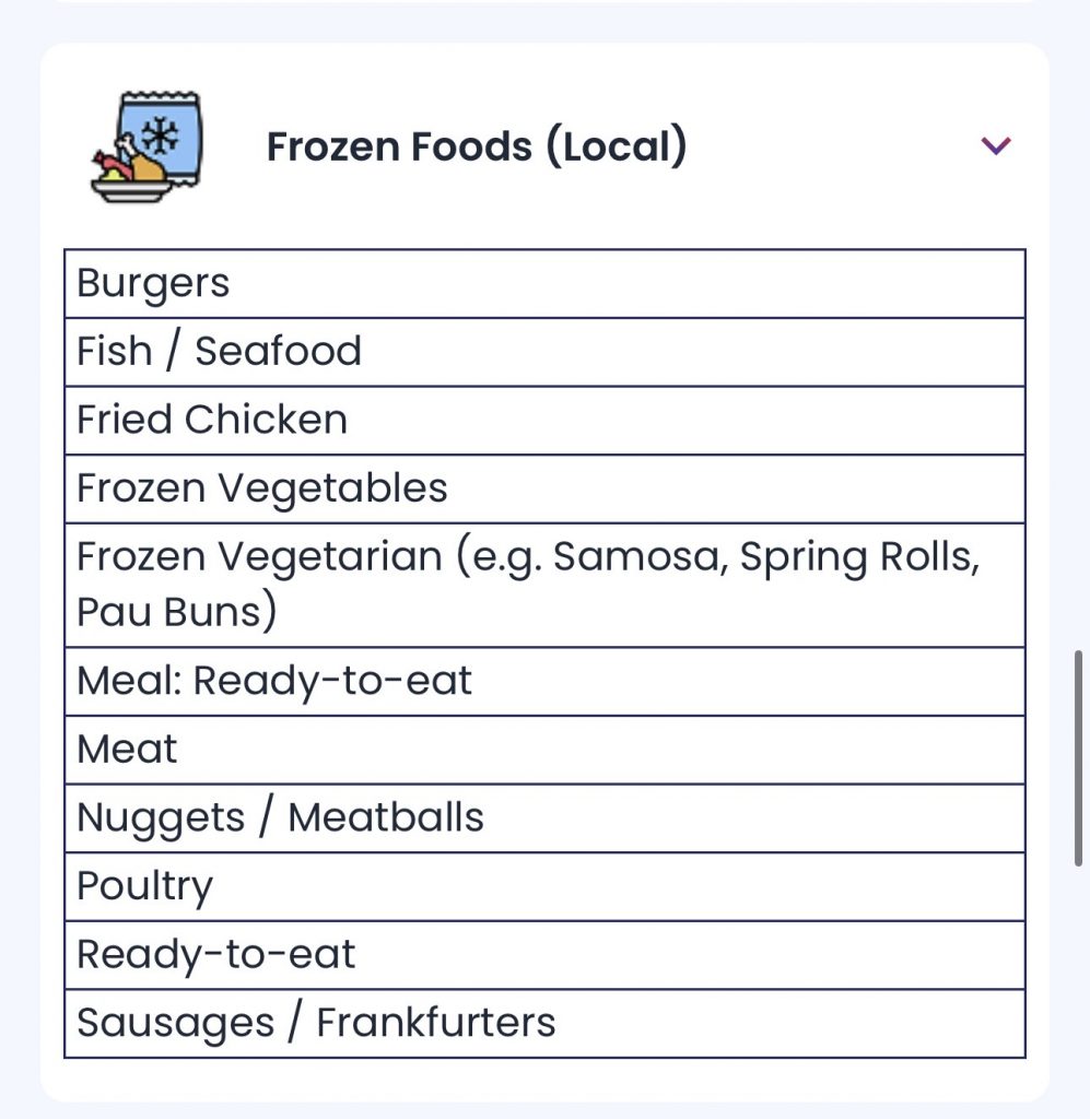 Eligible frozen food items include Poultry, Fried Chicken, Meat, Fish, Seafood, Burgers, Frozen Vegetables, Nuggets, Meatballs, Sausages and Ready-to-eat meals.