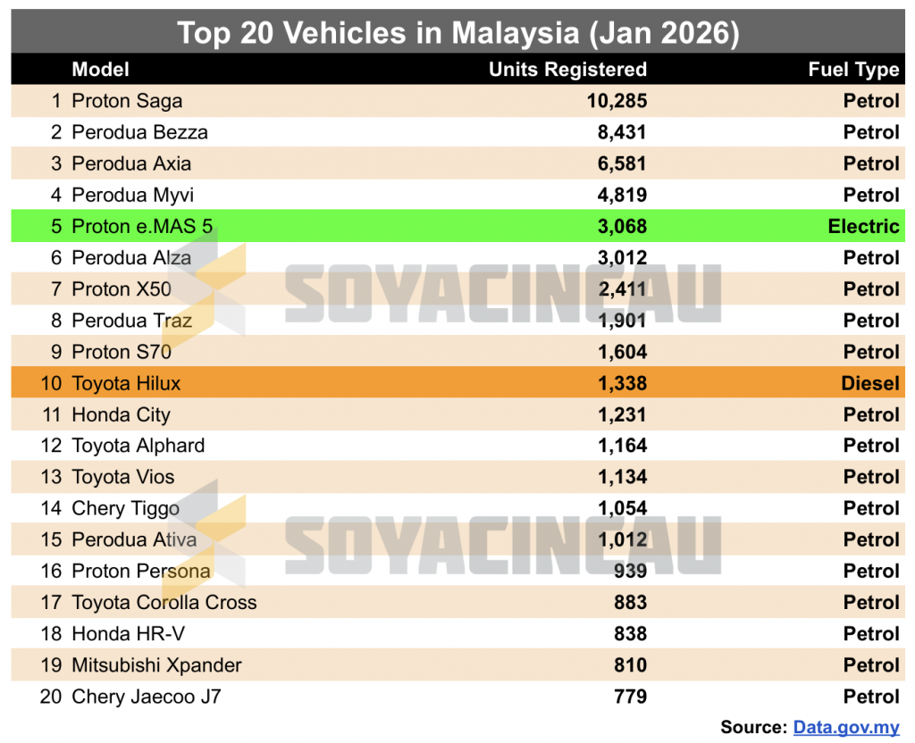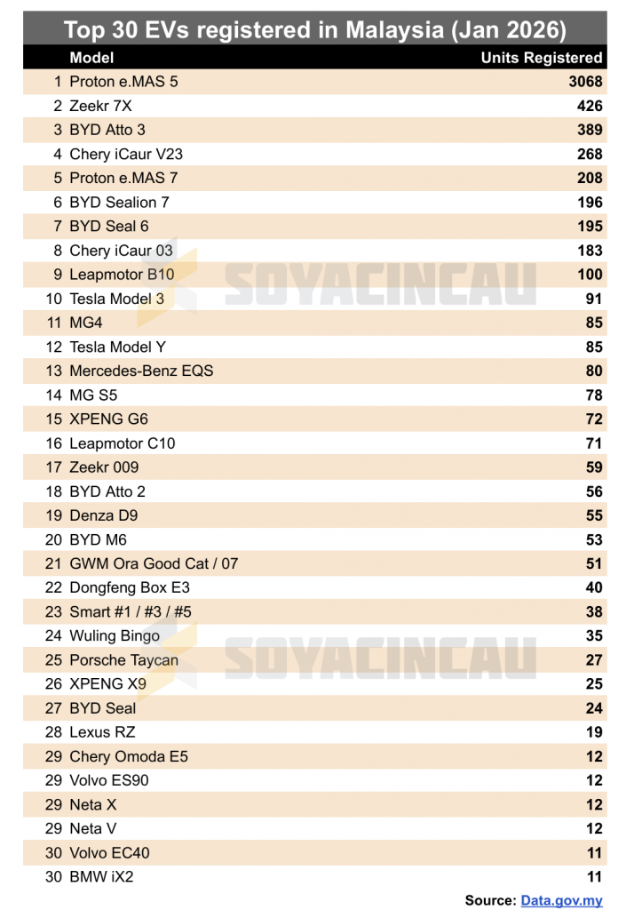 January 2026 also marked a milestone for mass-market EV adoption, with the Proton e.MAS 5 taking the #1 spot with 3,068 registrations. That’s nearly half of all EVs registered last month.
