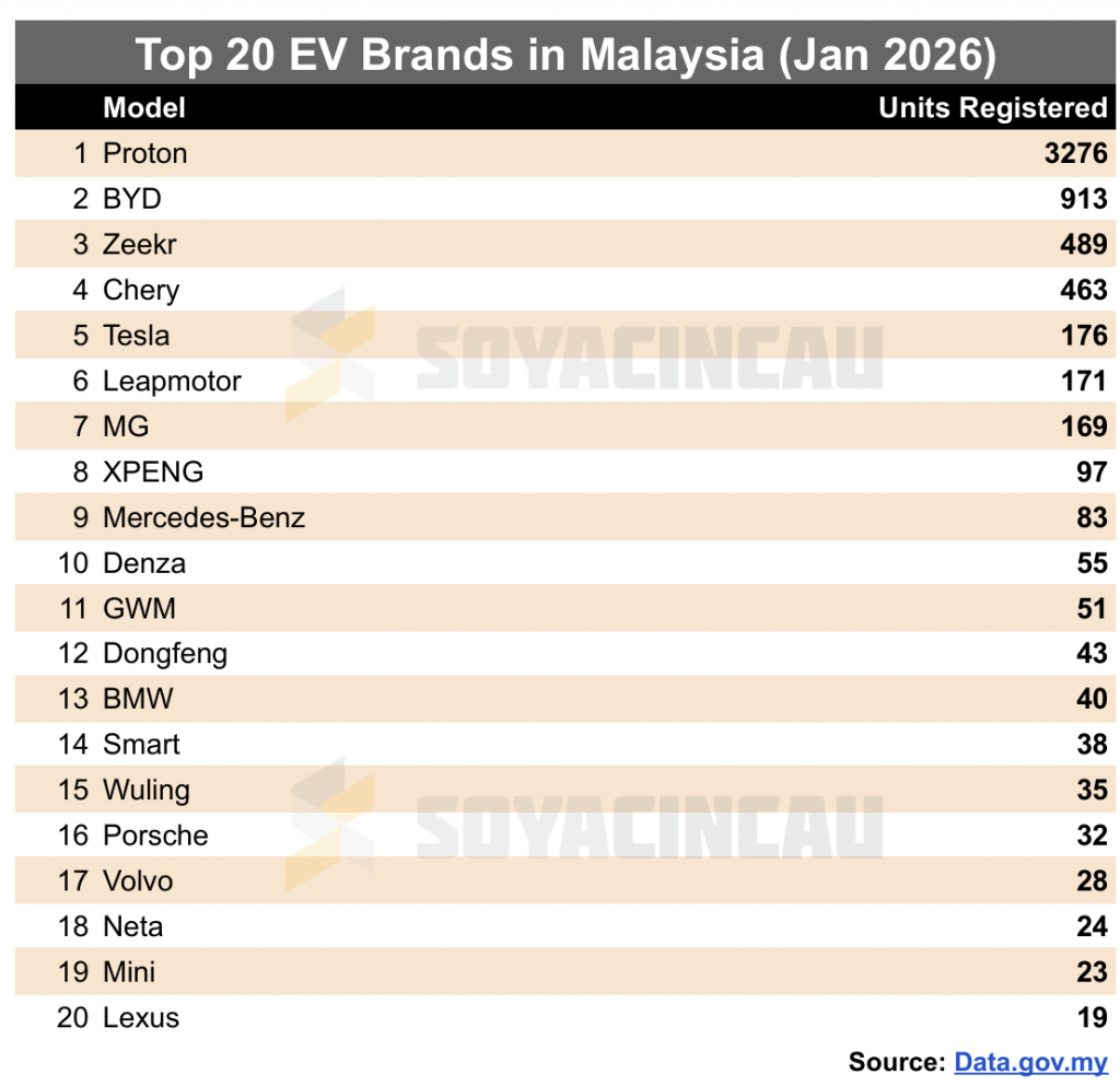 Top 20 EV brands in Malaysia for January 2026