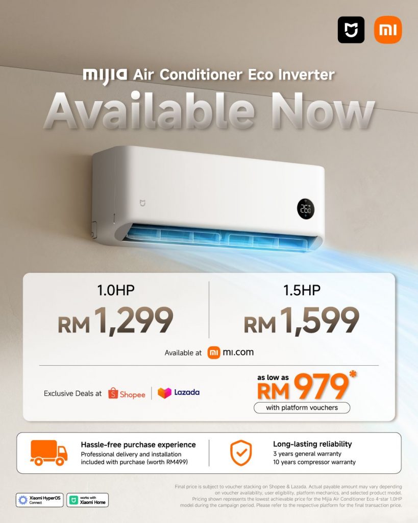 - Mijia Air Conditioner Eco 4-star Inverter 1.0HP – RM1,299 (Lazada: RM879.82, Shopee: RM900.00 )
