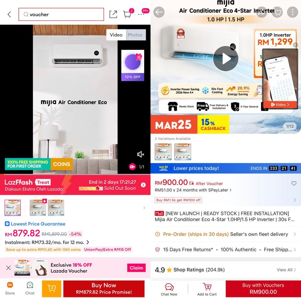With the on-going payday sale promotions on Lazada and Shopee, these air conditioners can be yours from under RM900. Here are the deals at the time of writing via the mobile app: