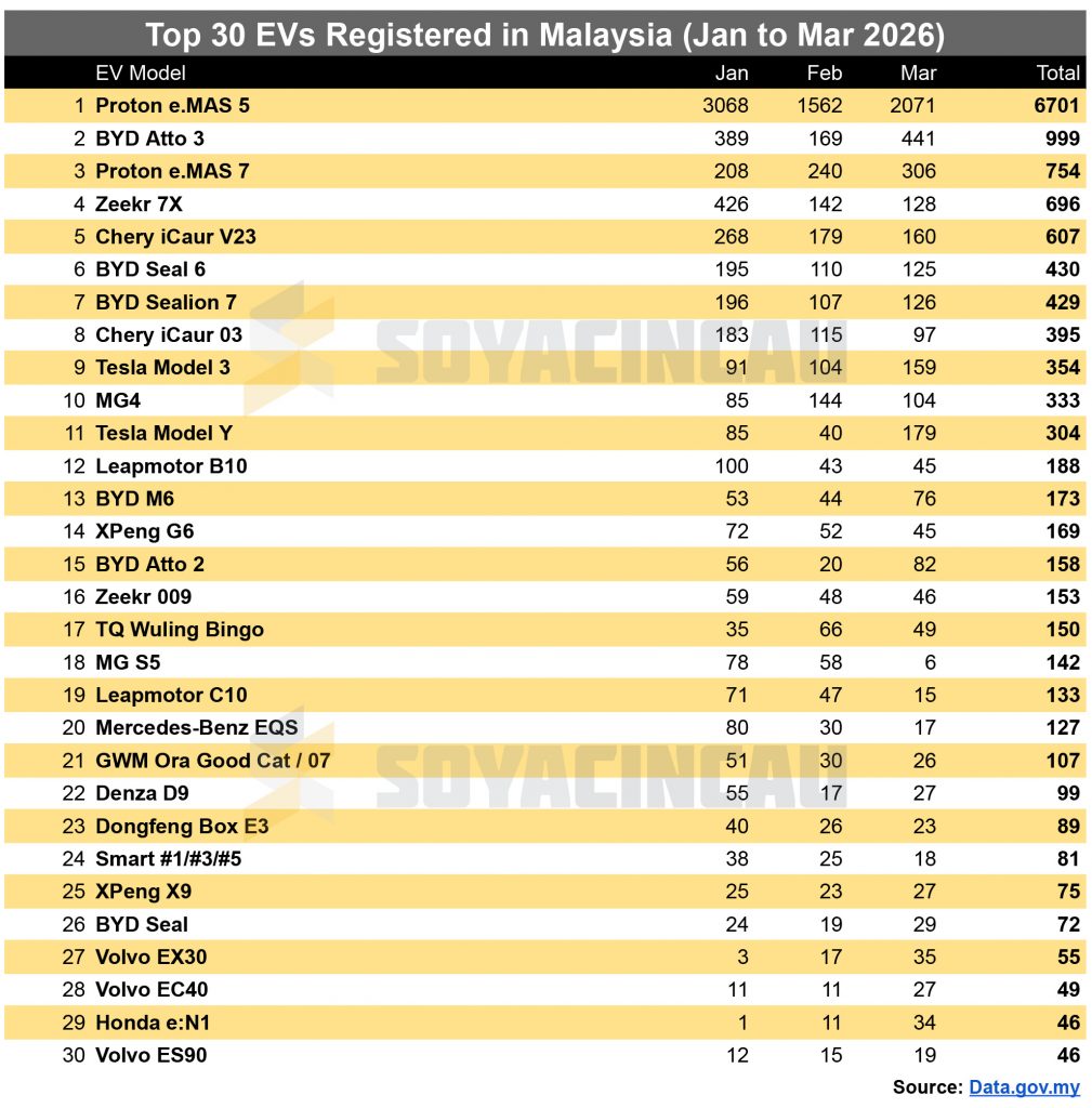 Top 30 EVs in Malaysia from January to March 2026