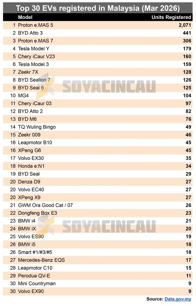 For the month of March 2026, the Proton e.MAS 5 continues to be Malaysia’s #1 EV model, leading by a wide margin with 2,071 units registered.