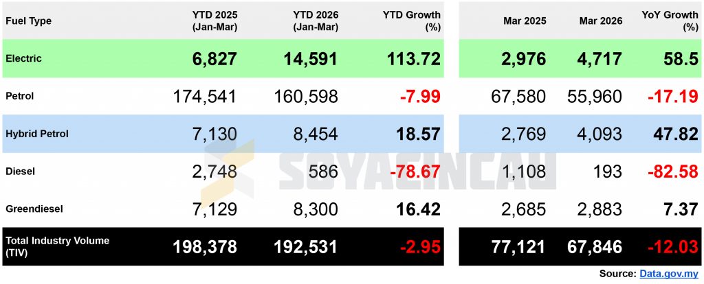 Malaysia’s electric vehicle (EV) segment continues to show strong growth in 2026, even as the broader automotive market softens. According to the latest JPJ registration data shared on the open data portal, a total of 4,717 EVs were registered in March 2026, representing a 58.5% increase year-on-year compared to 2,976 units recorded in March 2025.