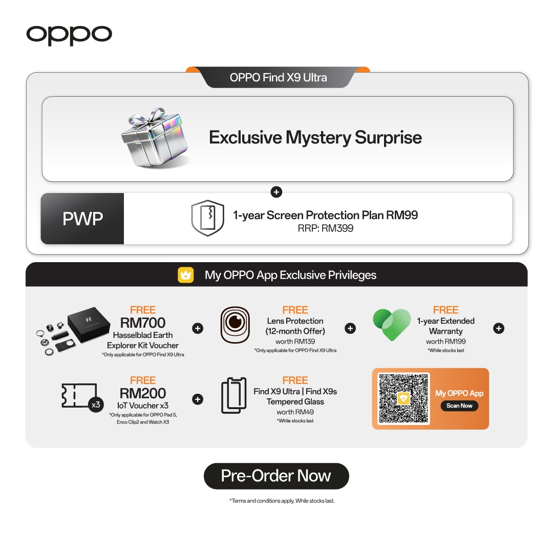 Pre-order for the OPPO Find X9 Ultra is now open. Be one of the first few to collect the phone from May 2nd, 2026, and enjoy exclusive early-owner privileges such as an exclusive mystery surprise, a 1-year screen protection plan at RM99 (worth RM399) and My OPPO APP exclusive Privileges worth RM1,287*.