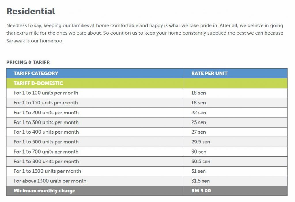 Residential users (Domestic) in Sarawak currently enjoy cheap electricity rates from as low as 18 sen per kWh for consumption below 150 kWh, while the highest tier is 31.5 sen per kWh for usage above 1300 kWh.