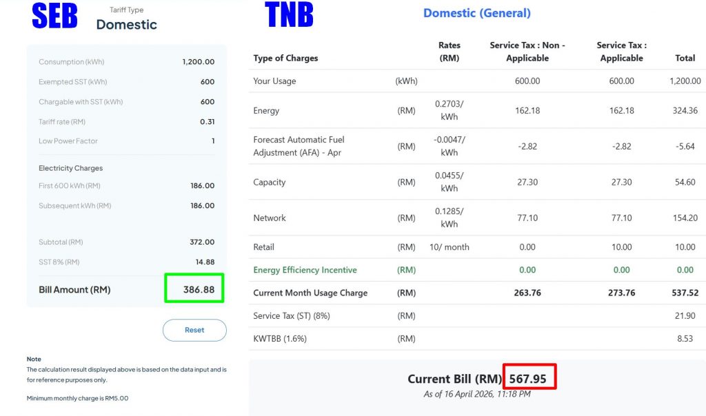 If we calculate the current bill estimation based on a monthly usage of 1,200kWh, a Sarawak household would only need to pay RM386.88 for their SEB bill versus RM567.95 for TNB Bill in Peninsular Malaysia.
