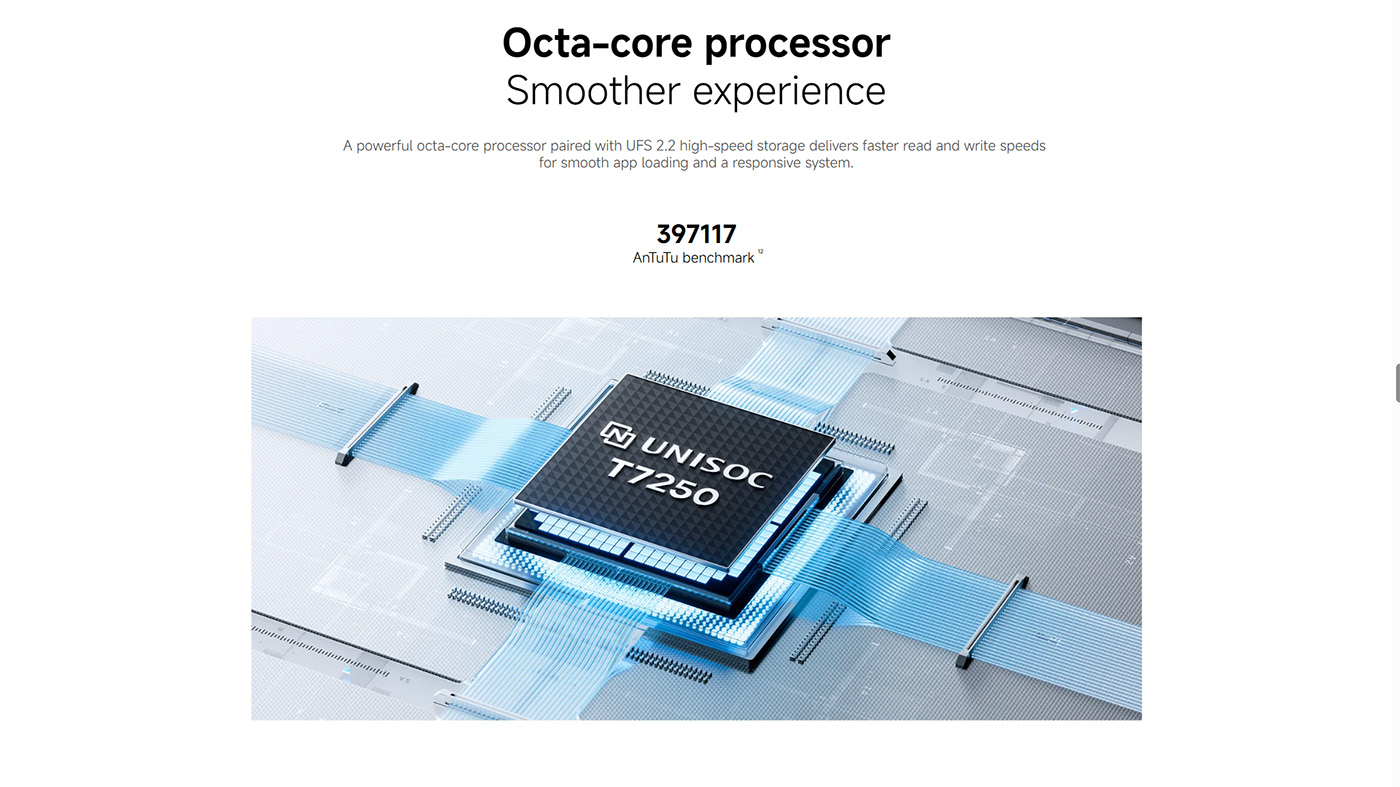 At the heart of the device is Unisoc’s T7250 12nm octa-core processor, clocked at up to 1.8GHz, paired with 4GB of LPDDR4X RAM that’s virtually expandable to 8GB and up to 128GB of UFS 2.2 storage.