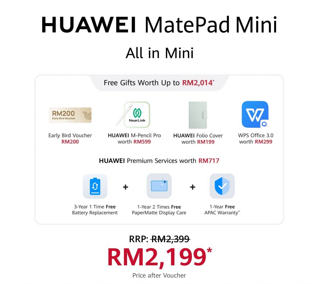 With the current promo, the Huawei MatePad Mini can be yours for only RM2,199 after deducting the RM200 early bird voucher.