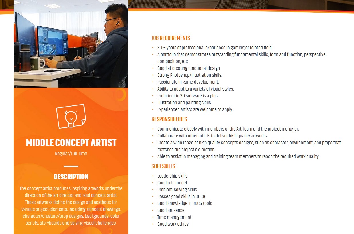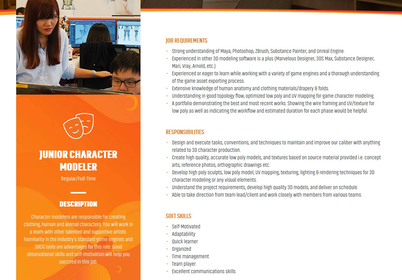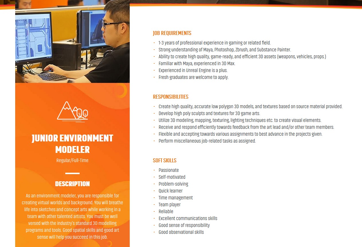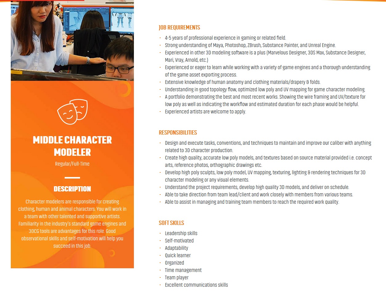 There are a total of eight positions opened to be filled at the studio. This is spread across four categories: animator, environment modeler, character modeler and concept artist. At present, there are two open positions under each category, one junior and the other being a middle level. According to Bandai Namco Studios Malaysia, fresh graduates are welcome to apply for the junior positions.