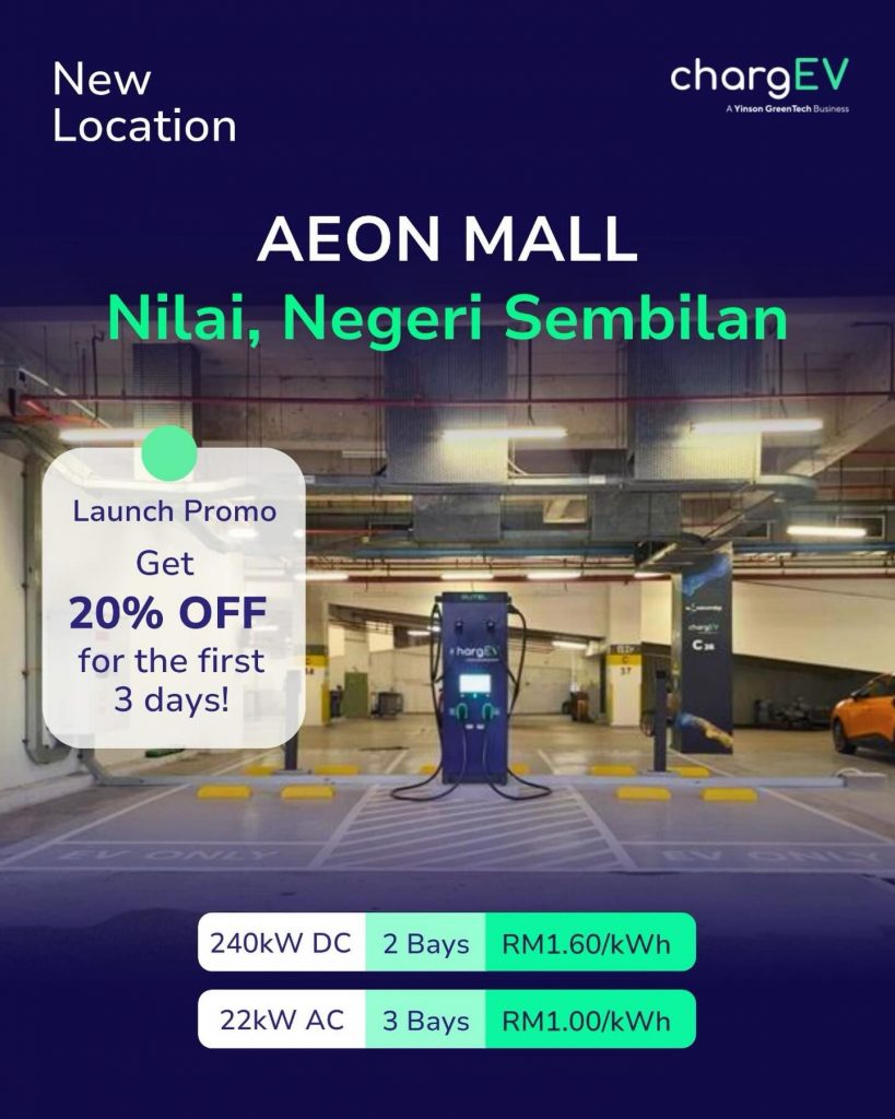 ChargEV has expanded the EV charging infrastructure at Aeon Mall Nilai in Negeri Sembilan. They have deployed an additional 240kW DC Charger and three more 22kW AC Charge Points at the mall.