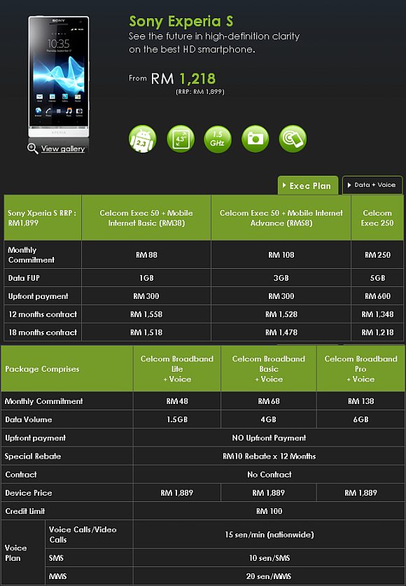 The Sony Xperia S plans from Celcom is finally revealed online with bundled pricing from RM1218. As usual, it comes bundled with a choice of 3 Celcom Exec plans and duration of either 12 months and 18 months contract duration. According to the website, Celcom indicates both white and black models are available.