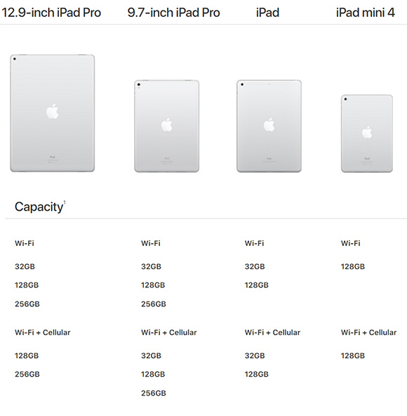 Officially, Apple is just offering 4 iPad models. You now have two iPad Pro models (12.9″ & 9.7″), a new 9.7″ iPad and the 7.9″ iPad mini 4. The iPad Pro is a high-end tablet which Apple claim is a viable desktop replacement for your home. For better productivity, there’s an optional keyboard and a digital Pencil stylus.