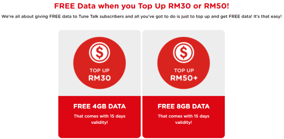 With this new revision, an RM30 top-up will give you 4GB of free data while RM50 and above will grant you 8GB for free. Unlike its previous offer, the validity of these free data is only limited to 15 days instead of 30 days previously as shown below.