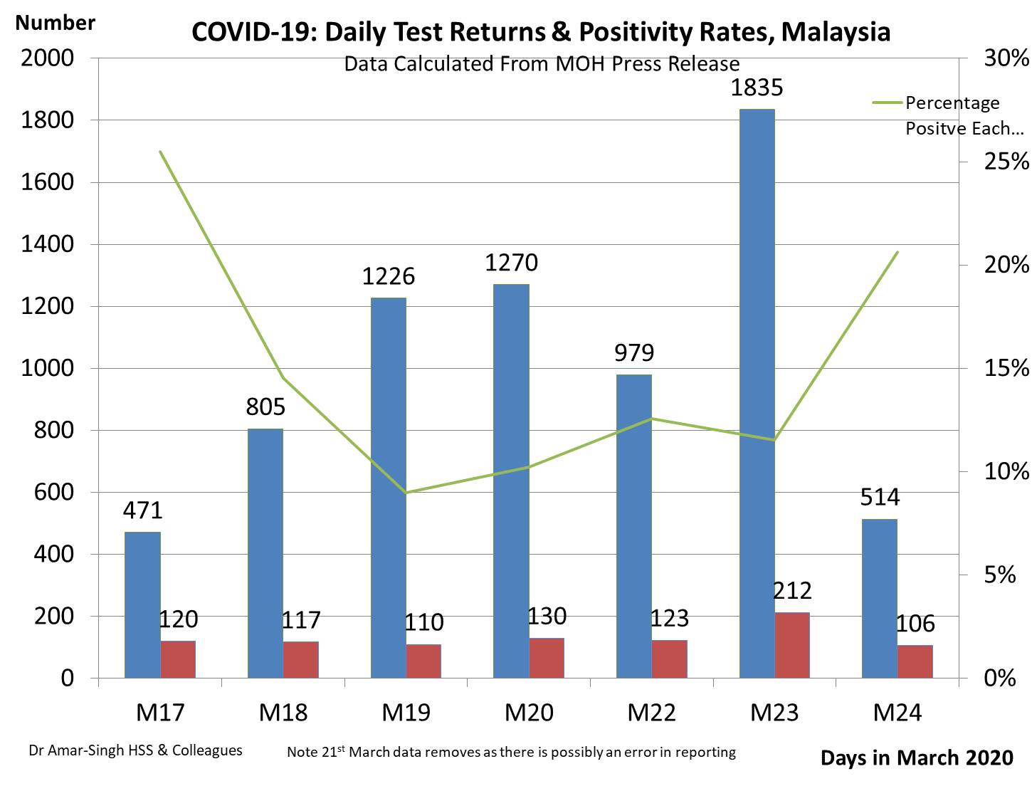 The second arm of our defence is testing. We need to identify all infected persons and quarantine them. I have spoken earlier about this but would like to highlight a little more on what is happening currently. The graph below shows the ‘test returns’ and ‘positivity rates’ each day for COVID-19, based on calculation on data obtained from MOH press releases. I am indebted to two Malaysians I have met online during this epidemic for thinking through this data with me and offering valuable insights (they have chosen to remain anonymous).