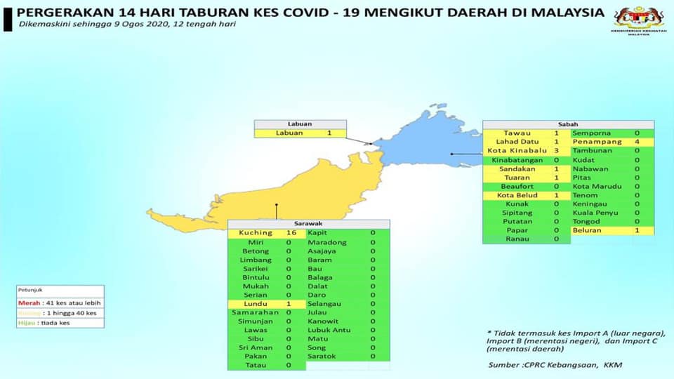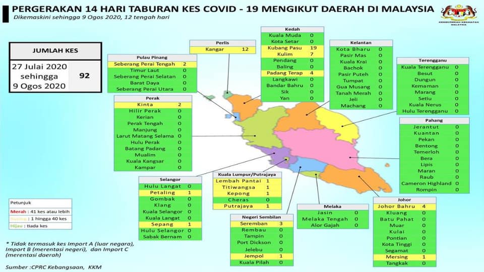 As of 12pm today, there are no red zones in the country. Kubang Pasu has 19 active cases followed by Kuching with 16 cases and Kangar with 12 cases. The states of Kelantan, Terengganu, Pahang and Melaka are currently green.